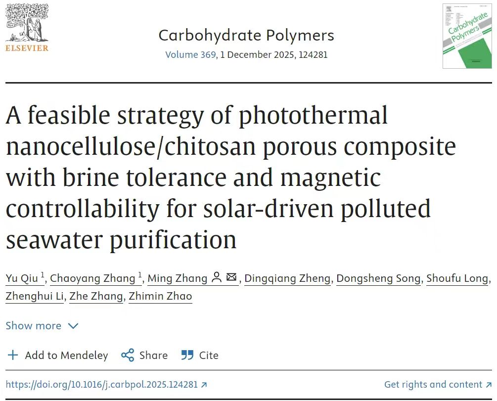 2025年8月,北华大学材料科学与工程学院研究生邱雨以第一作者在《Carbohydrate Polymers》期刊(中科院一区Top, IF=12.5)发表题为“A feasible strategy of photothermal nanocellulose/chitosan porous composite with brine tolerance and magnetic controllability for solar-driven polluted seawater purification”的学术研究论文。张明教授为通讯作者。