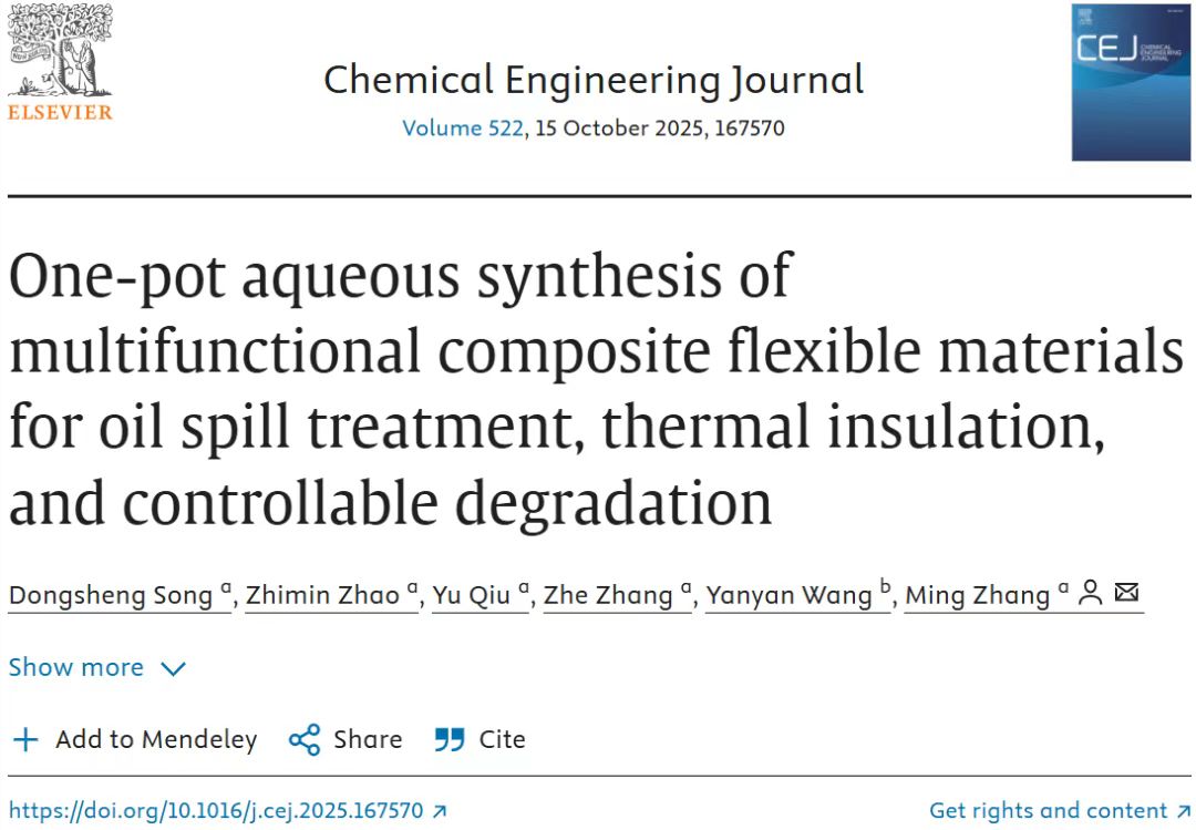 2025年8月,北华大学材料科学与工程学院研究生宋冬升以第一作者在《Chemical Engineering Journal》期刊(中科院、JCR双一区Top, IF=13.2)发表题为“One-pot aqueous synthesis of multifunctional composite flexible materials for oil spill treatment, thermal insulation, and controllable degradation”的学术论文。张明教授为通讯作者。