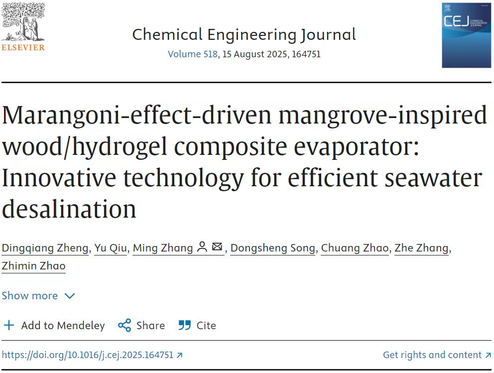 2025年6月,北华大学材料科学与工程学院研究生郑定强以第一作者在《Chemical Engineering Journal》期刊(中科院一区,Top, IF=13.2)发表题为“Marangoni-effect-driven mangrove-inspired wood/hydrogel composite evaporator: Innovative technology for efficient seawater desalination”的学术研究论文。张明教授为通讯作者。