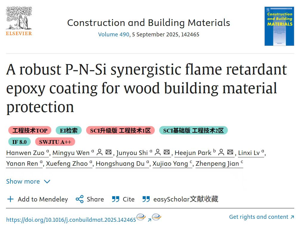 2025年8月,北华大学材料科学与工程学院研究生左瀚文以第一作者在《Construction and Building Materials》期刊(中科院一区Top, IF=8.0)发表题为“A robust P-N-Si synergistic flame retardant epoxy coating for wood building material protection”的学术论文。温明宇教授为通讯作者。