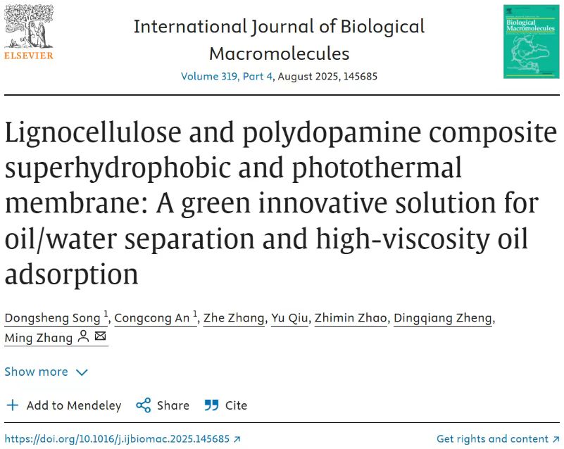 2025年7月,北华大学材料科学与工程学院研究生宋冬升在《International Journal of Biological Macromolecules》期刊(中科院二区Top期刊, IF=8.5)发表题为“Lignocellulose and polydopamine composite superhydrophobic and photothermal membrane: A green innovative solution for oil/water separation and high-viscosity oil adsorption”的学术论文。张明教授为通讯作者。