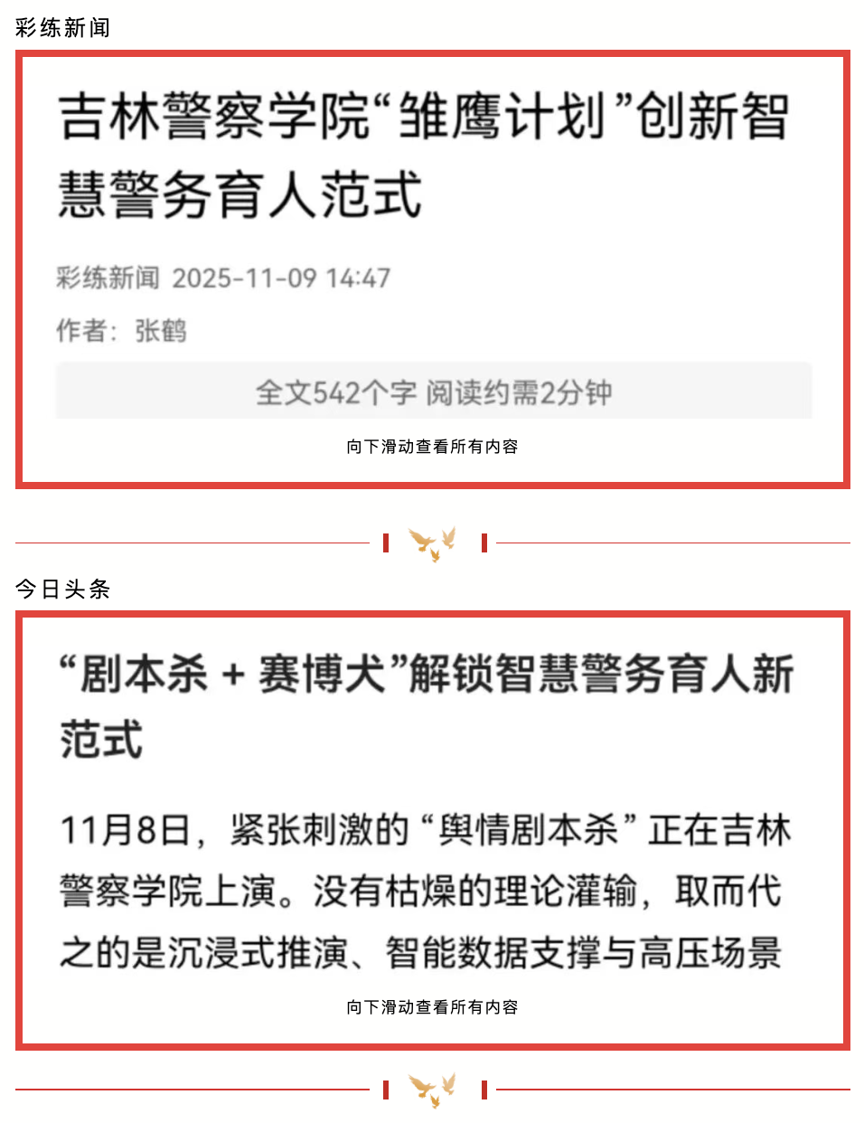 11月8日,吉林警察学院第三期“雏鹰计划”基地班开设课程《当剧本杀遇上舆情场:组织行为与管控闯关指南》正式结课。此次课程以6课时的设计,成功构建了“全景推演—机器人采集—全息压力发布”的三段式教学闭环,为智慧公安教育打造了新范式。