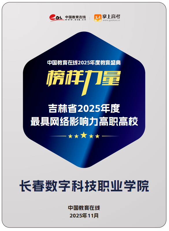 近日,在中国教育在线主办的“榜样力量·2025年度教育盛典”评选中,长春数字科技职业学院凭借在网络形象塑造、数字化传播创新及产教融合实践中的突出表现,荣膺“吉林省2025年度最具网络影响力高职高校”称号。此次获奖是对长春数字科技职业学院以数字技术驱动教育创新、构建全媒体传播体系的充分肯定。