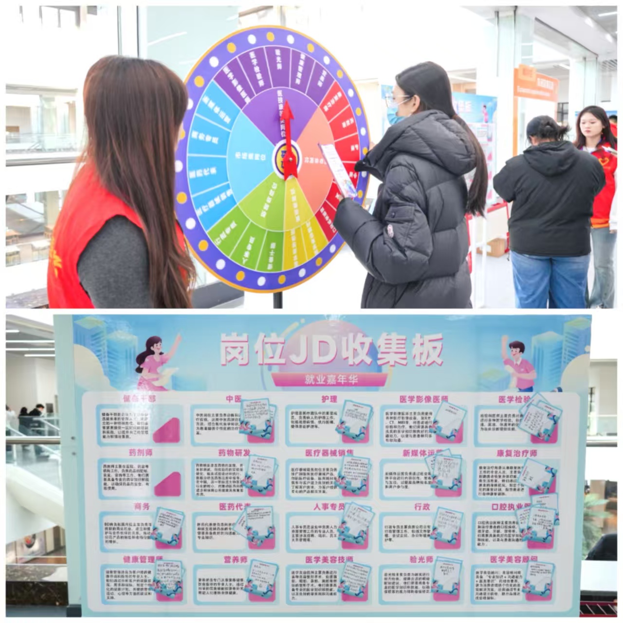“生涯启航站”设计了一场名为“投壶问路”的深度体验活动。通过投壶这一极具仪式感的方式,模拟其选择目标的实现过程;“岗位指南针-JD猜猜看”的活动现场设有“岗位信息大转盘”,同学们通过转动转盘,随机获取来自不同岗位的信息片段,有效拓展了其对就业市场宽度与多样性的理解。