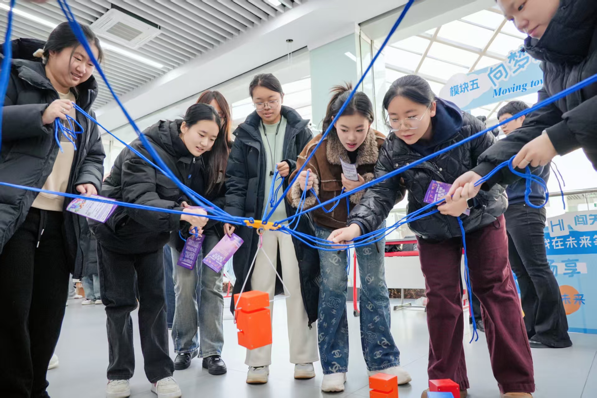 与之相辅相成的“齐心协力-步步高升”团队挑战,让学生深刻体悟到沟通、协作与信任在职场环境中的核心价值,有效培养了其团队意识与集体荣誉感。