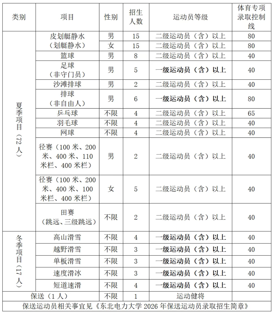 2.具备东北电力大学招生项目要求的运动员技术等级称号。考生运动员技术等级以“国家体育总局运动员技术等级系统”公示的数据信息为准。报名考生的等级证书审批日期为:冬季项目为2016年1月1日至2025年12月31日;夏季项目为2016年1月1日至2026年3月10日。