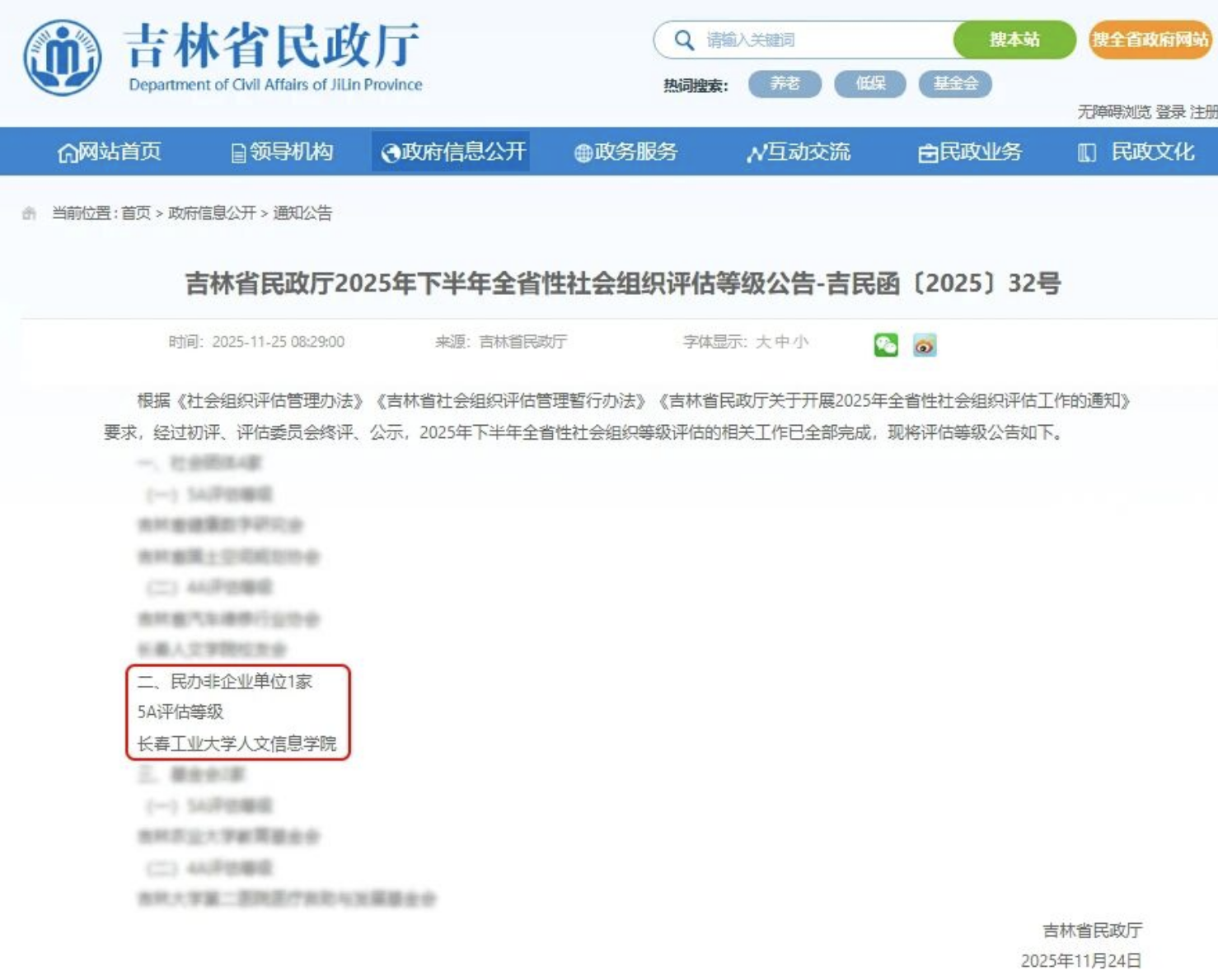 近日,长春工业大学人文信息学院凭借规范的内部治理、卓越的业务成效和良好的社会声誉,在吉林省民政厅组织的社会组织评估中,成功获评吉林省5A级社会组织。