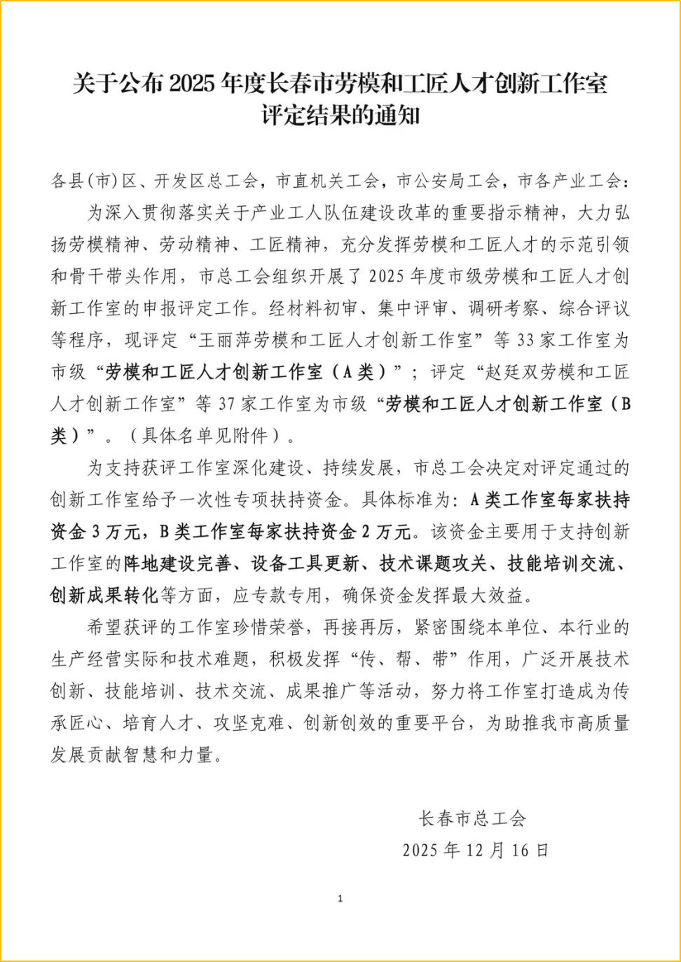 此次市级创新工作室评定工作由长春市总工会牵头组织,经过材料初审、集中评审、调研考察、综合评议等程序,最终确定33家工作室为市级“劳模和工匠人才创新工作室(A类)”;37家工作室为市级“劳模和工匠人才创新工作室(B类)”。