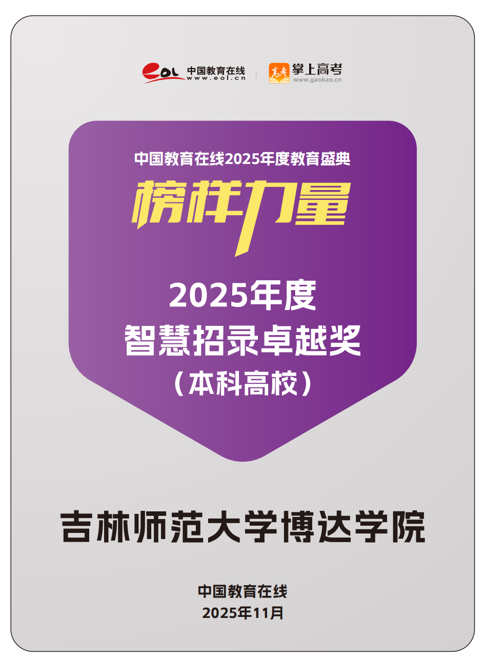 近日,教育在线“榜样力量·2025年度教育盛典”优秀案例名单公布。吉林师范大学博达学院凭借在招录工作中对智慧招录相关技术工具的高水平运用及卓越成果,获评“2025年度智慧招录本科高校”。