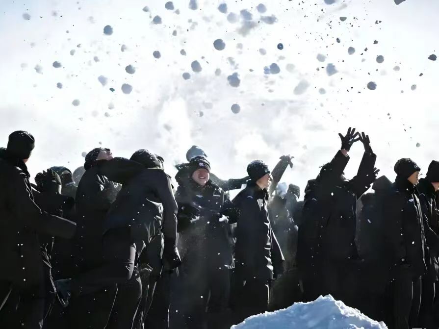 随着主持人一声“活动正式开始”响彻晴空,震撼的一幕随之上——两千余名新生齐齐俯身,攥起手边的白雪,又几乎在同一瞬间,奋力将雪球掷向天际。两千个雪球如逆飞的流星群划过冬日蓝天,似两千颗炽热的初心理想升腾,像两千发并肩启程的冲锋信号,更若两千朵为青春与使命而绽放的冰雪礼赞。这沸腾的开场,以最纯粹的力量与最简单的形式,瞬间点燃了全场,也拉开了这场集趣味、协作与实战锤炼于一体的冰雪嘉年华序幕。