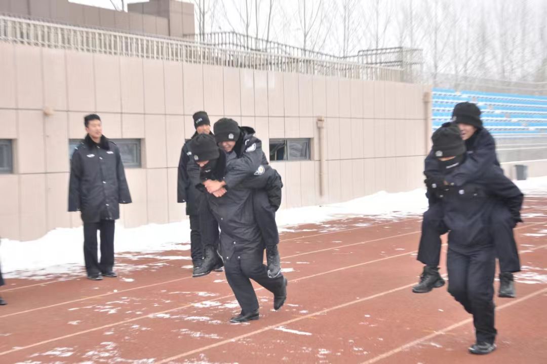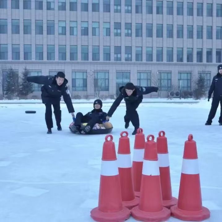 紧随开场的热浪,首个项目 “冰面闪电追击” 迅捷展开。这项源自东北“打出溜滑”传统的竞赛,被赋予了贴近警务实战的内涵——模拟在冰面、雪地等湿滑路面上的快速接近与紧急制动。队员们仅凭双脚在冰面蹬踏滑行,比拼爆发力、平衡力与冲刺速度。赛道上一道道飞驰的身影,在阳光下划出闪亮的轨迹,充分锤炼着预备警员在特殊环境下的单兵机动能力。