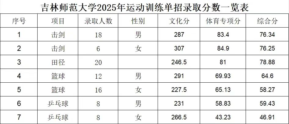 3.在文化成绩和体育专项成绩达到吉林师范大学最低录取控制线的基础上,按照综合分(综合分=(文化成绩/6)×30%+体育专项成绩×70%),分招生计划项目从高到低择优录取。