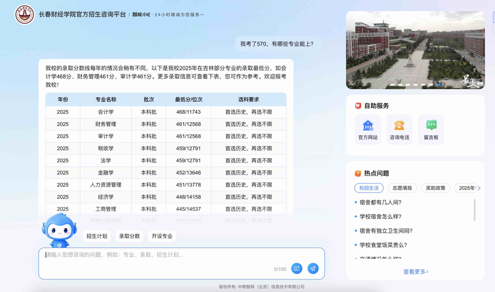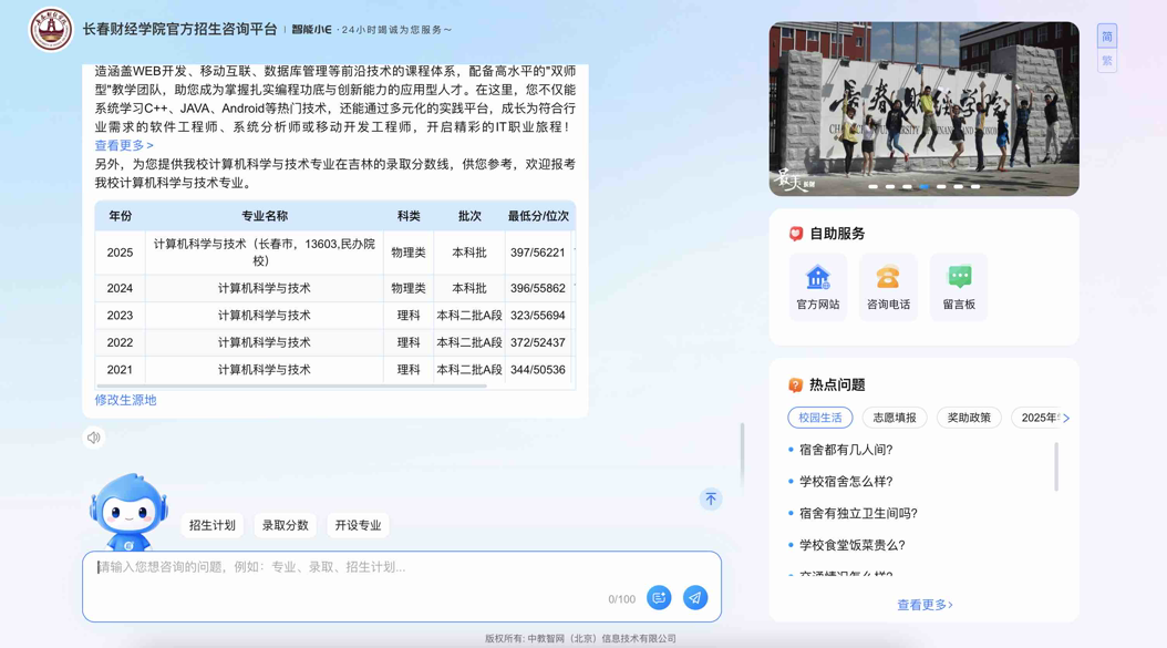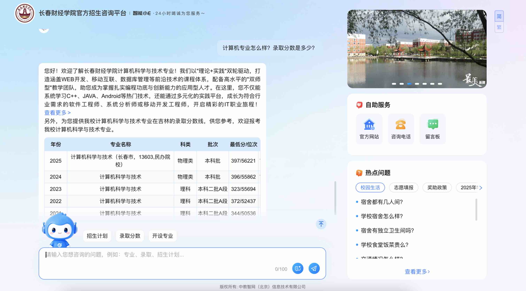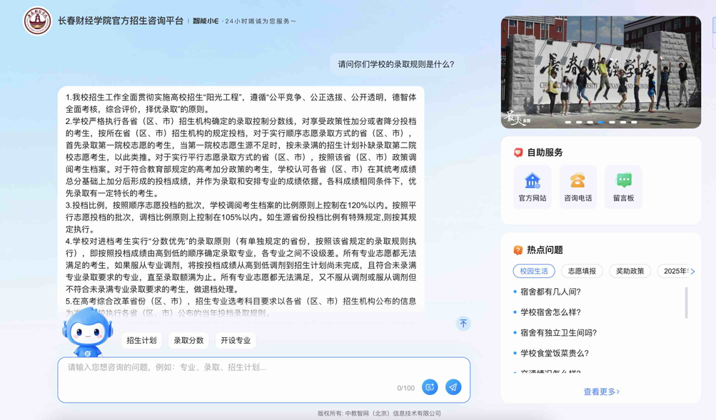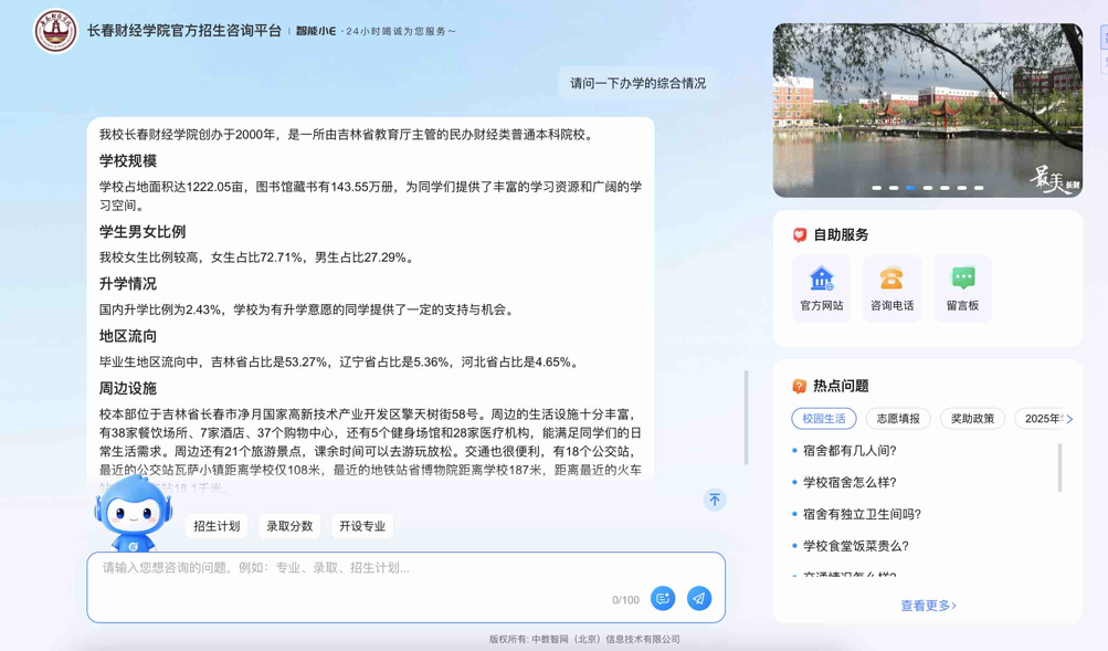 长春财经学院智能招生问答助手,如同您报考路上的贴心伙伴,全程答疑解惑、指引方向。快来体验,让它陪您开启美好的大学新旅程!