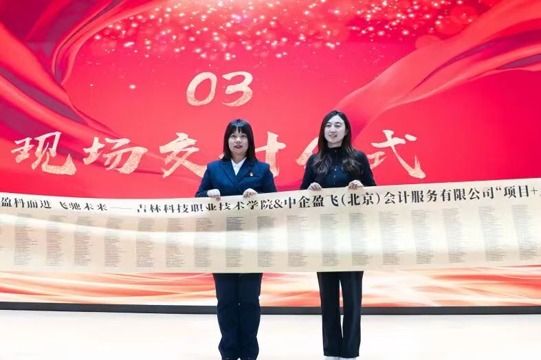 吉林科技职业技术学院党委副书记、副校长赵宇表达了对于深化产教融合、培育高素质技术技能人才的坚定信心。现代服务产业学院院长李芳详细分享了“项目+人才”双交付模式的探索历程与宝贵经验。学生代表张雯琪则从切身感受出发,讲述了在会计工坊中从理论到实践、从生疏到熟练的成长蜕变,言语间充满收获与感恩。中企盈飞总经理郝博伟在发言中充分肯定了合作成果,并对未来共同培养更多适配产业需求的会计人才提出了展望。