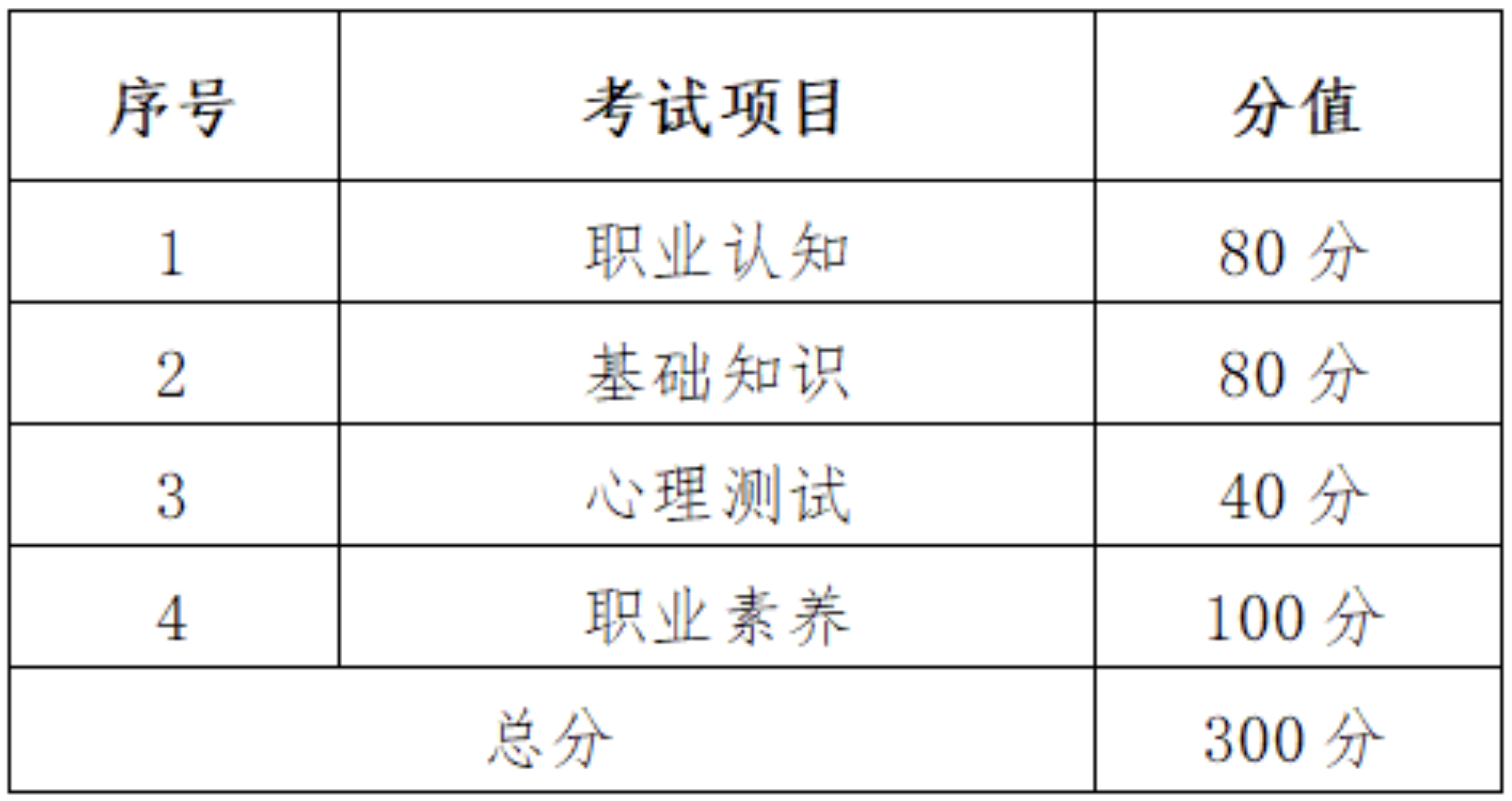 职业技能测试分为职业认知、基础知识、心理测试、职业素养四个测试项目,总分300分。