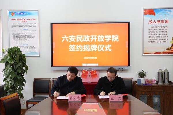 随后,曹文武副局长与张敏校长代表双方签署了《六安市民政人才战略合作协议书》,并共同为六安民政开放学院揭牌。下一步,六安市民政局和六安开放大学将扎实落实学历提升、持证率提升和实务能力提升“三项工程”,为推动新时代六安民政事业高质量发展提供人才保障。(撰稿:朱婧妮;审核:张敏;编发:朱婧妮)