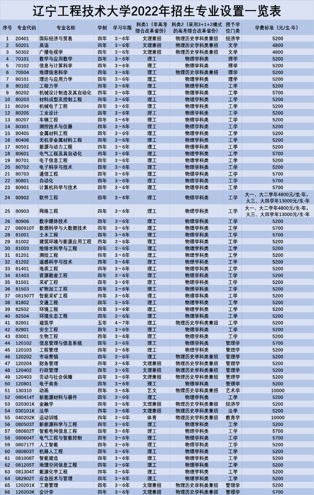 阜新校区玉龙校园招生专业:测绘工程、遥感科学与技术、地理空间信息工程、地理信息科学、机械设计制造及其自动化(含专升本)、机械电子工程、车辆工程、工业设计、能源与动力工程、土木工程(含专升本)、建筑环境与能源应用工程、给排水科学与工程、智能建造、建筑学、交通工程、广播电视学、动画、数字媒体技术、财务管理、电气工程及其自动化(专升本)、计算机科学与技术(专升本)、软件工程(专升本);