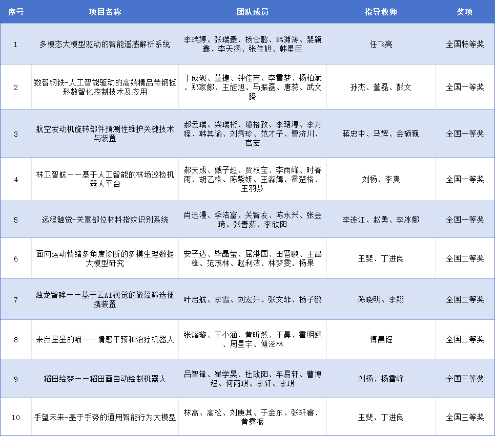 东北大学(含秦皇岛分校)在本次大赛的多个赛道中获得佳绩:主体赛:一等奖2项、二等奖1项、三等奖9项,“揭榜挂帅”专项赛:特等奖6项(含擂主奖1项)、一等奖3项、二等奖4项、三等奖2项,“人工智能+”专项赛:特等奖1项、一等奖4项、二等奖3项、三等奖2项。