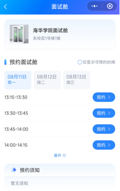 进入预约面试舱界面,在该界面中,学生可根据自己的安排挑选面试舱进行预约。