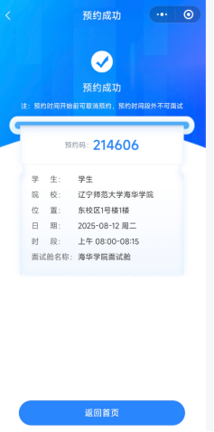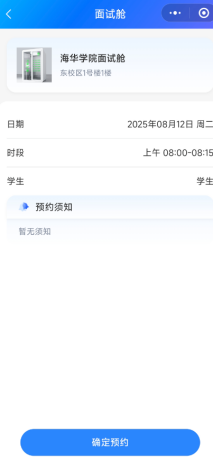点击预约按钮后,会显示出学生预约面试舱的名称、位置、日期和时间,学生确认无误后,可点击确认预约。