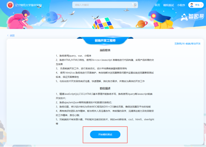 查看选择的岗位相应的职责和描述后,开始模拟面试。