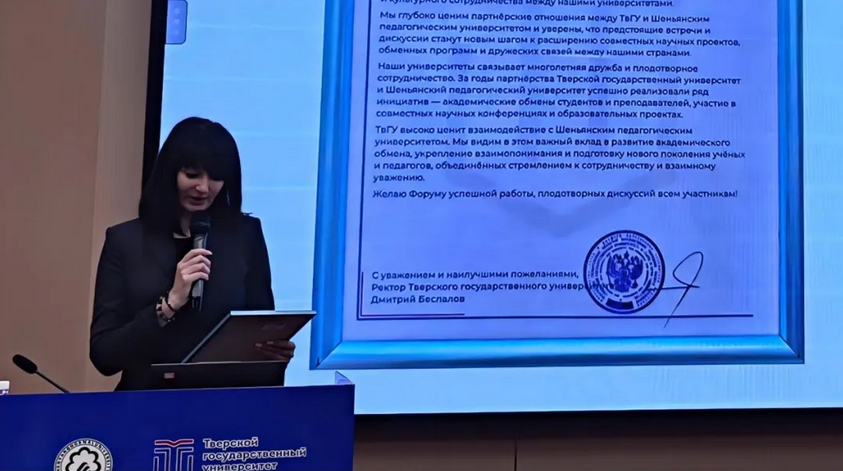 俄罗斯特维尔国立大学副校长尤利娅·尼古拉耶夫娜·戈罗季斯卡娅宣读了俄罗斯特维尔国立大学校长对本次学术会议的致辞文书,表达了对两校学术与文化交流的热切期待,希望未来在更大范围继续深耕合作,共同培养优秀专业人才。