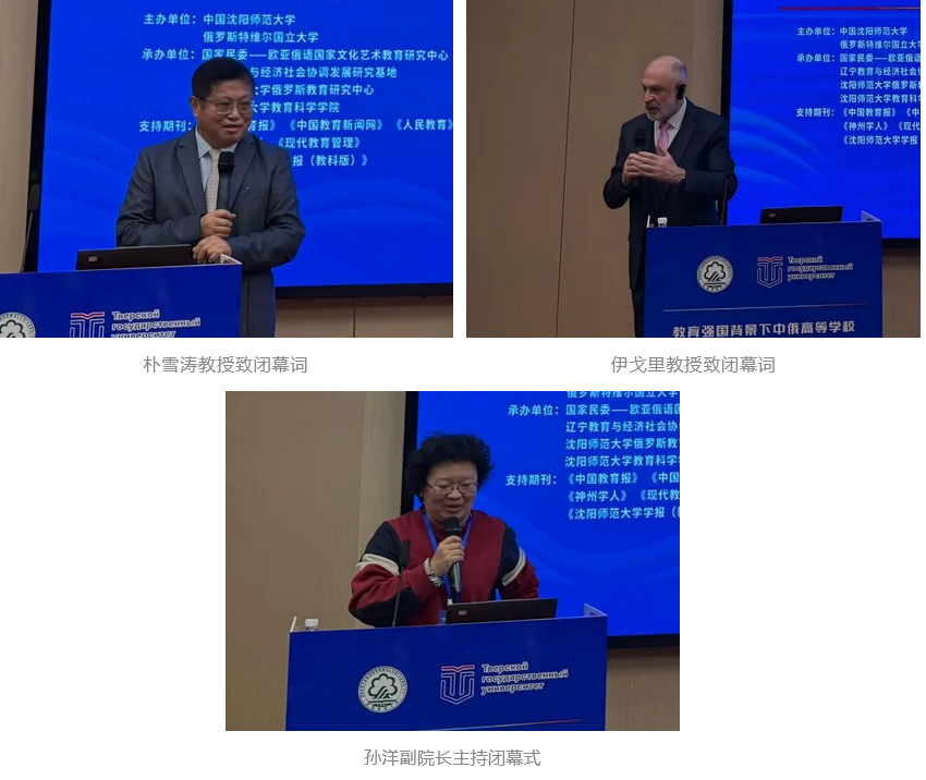 闭幕式上,中方代表朴雪涛教授和俄方代表伊戈里·达维多维奇·列利奇茨基院士分别进行了精彩的总结致辞。双方一致认为,本次会议不仅是中俄人文教育改革的一次深度思想碰撞,更是对俄罗斯教育科学院士工作站年度工作机制的有力、持续落实。会议在深化彼此学术理解、应对全球教育挑战方面达成了多项重要共识,同时对服务区域经济社会发展起到了积极的助推作用。这也标志着中俄两国高等教育将继续深化合作,双方携手共同迈向教育强国建设的新征程。闭幕式由教育科学学院副院长孙洋主持。