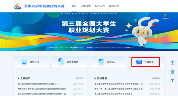 登录指引:请登录全国大学生职业规划大赛平台,选择"生涯闯关",开启属于你的成长之旅。