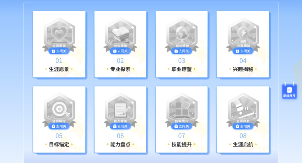 核心功能:八大关卡贯穿"知·行·悟"全流程,从设定生涯愿景、寻找榜样,到锁定职业目标、提升核心能力,全程陪伴你的每一步成长。