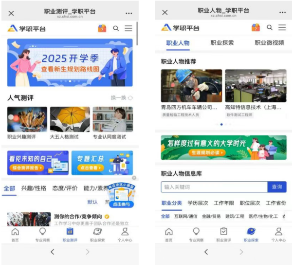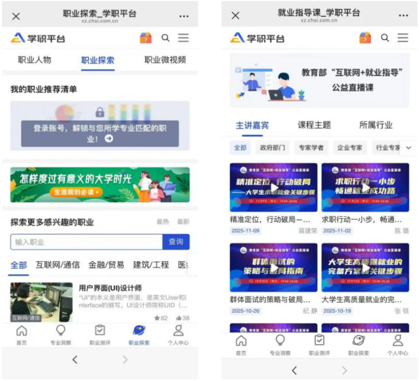 核心模块:职业测评、职业人物、职业探索、就业指导课程