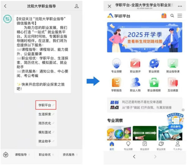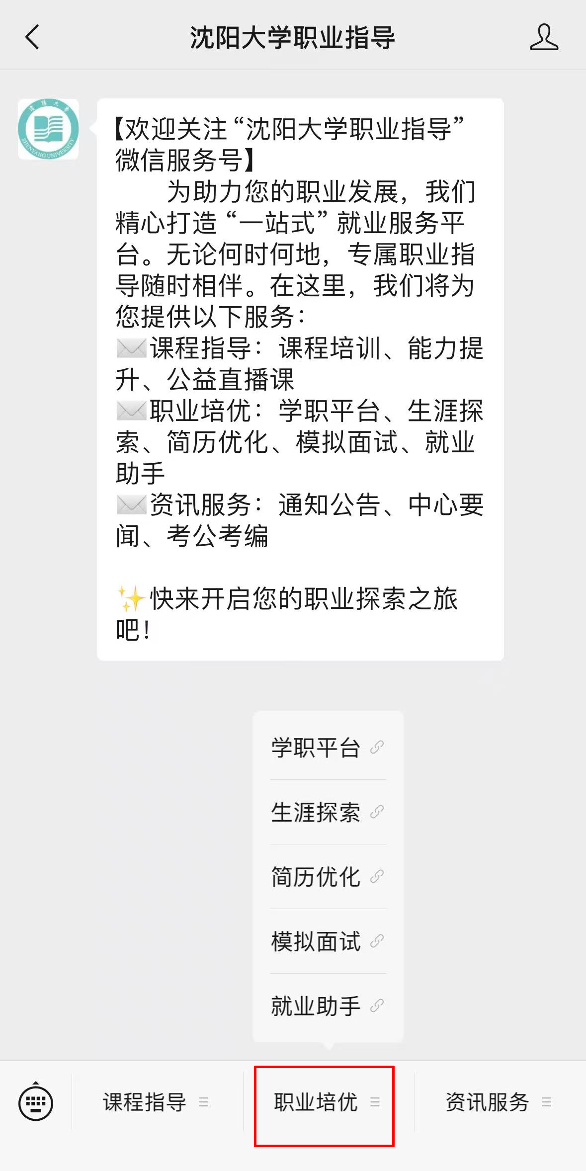 使用路径:关注“沈阳大学职业指导” → “职业培优” → “学职平台”