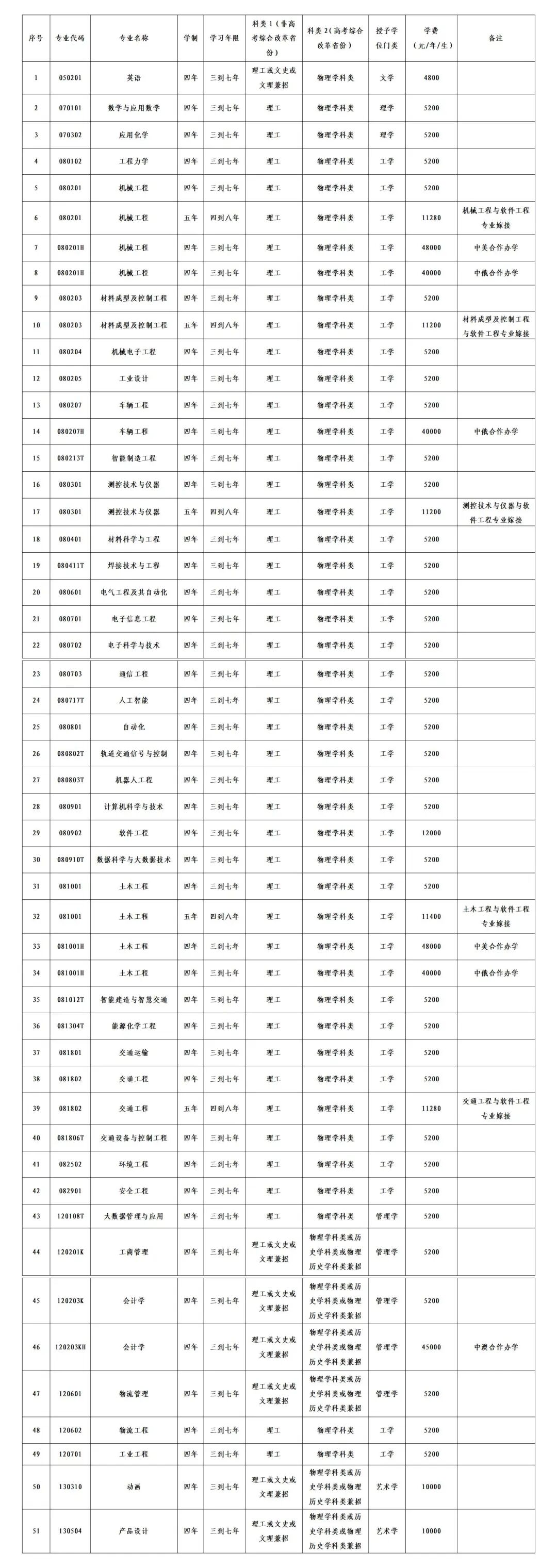 2.会计学(中澳合作办学)、机械工程(中美合作办学)、土木工程(中美合作办学)、机械工程+软件工程、材料成型及控制工程+软件工程、测控技术与仪器+软件工程、交通工程+软件工程、土木工程+软件工程、软件工程、计算机科学与技术、数据科学与大数据技术、大数据管理与应用、人工智能等专业,非英语语种考生慎重报考。