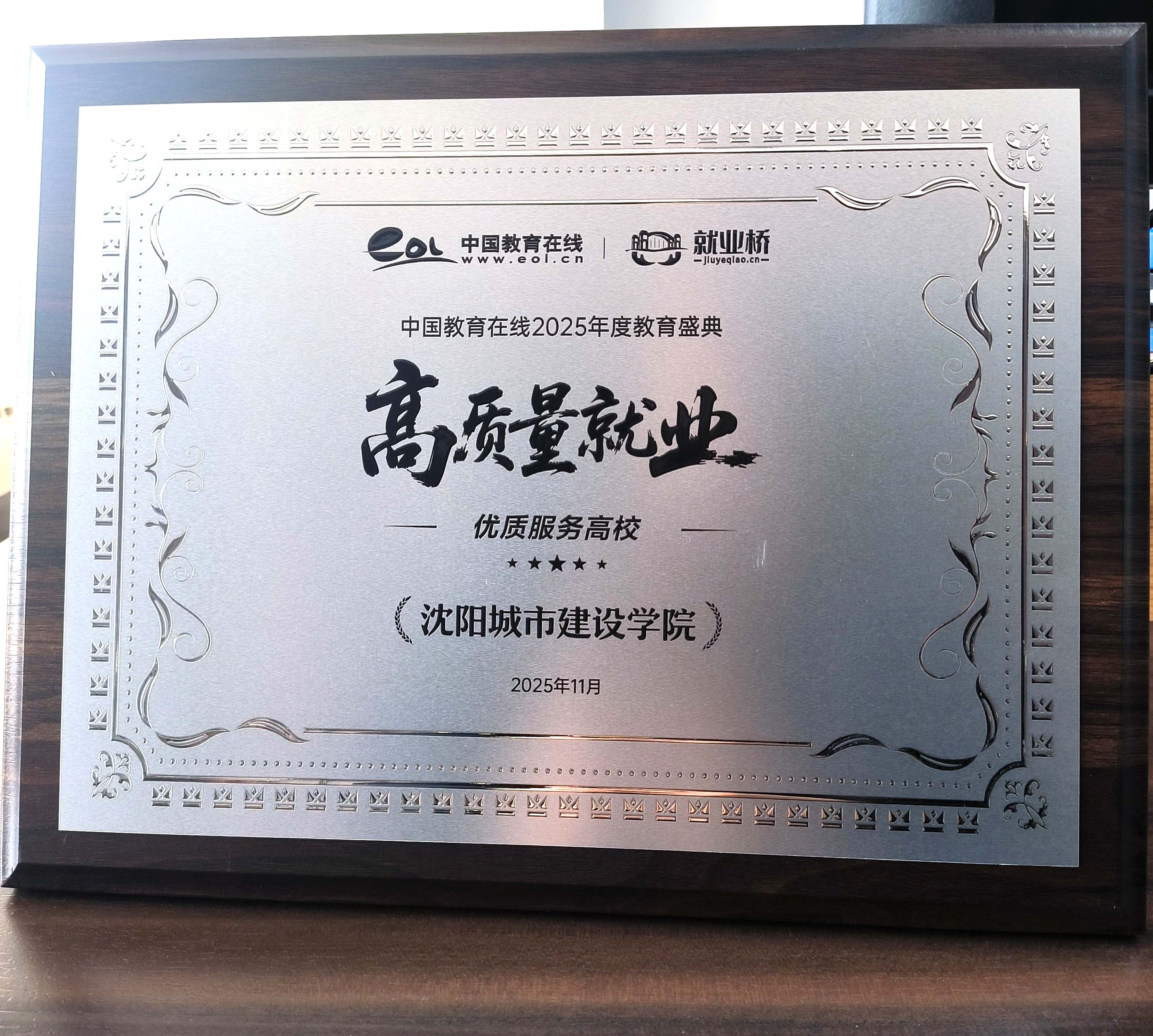 为深入贯彻党中央、国务院关于促进高校毕业生等青年就业创业的决策部署,落实《人力资源社会保障部 教育部 财政部关于做好2025年高校毕业生等青年就业工作的通知》等最新政策精神,挖掘和推广就业工作典型。中国教育在线·就业桥举办了“高质量就业”2025年度教育盛典活动,表彰高校就业工作数智化转型,创新实践的优秀案例,对推动高校就业跨越式发展,汇聚创新动力的榜样单位进行推广。沈阳城市建设学院应邀参选并荣获“2025高质量就业·优质服务高校”荣誉称号。学校将以此为力量源泉,探索就业发展的创新事迹,分享就业改革的有益经验,为高校毕业生高质量就业发展提供动力引领。