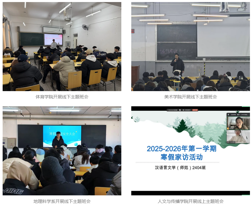 期末及寒假前夕,各院系立足学生管理工作实际,精准把握关键节点,分层分类组织召开线下线上主题班会、年级大会。班会聚焦期末考风考纪、诚信素养培育、假期安全防护三大核心要点开展专题教育,构建起“考前引导——假期护航——成长赋能”的全链条育人体系。同时,围绕寒假安全教育、假期学习规划、学生心理健康三大维度,指导学生制定科学合理的假期学习计划,聚焦出行人身安全、网络诈骗防范、消防安全等关键内容开展警示教育。通过典型案例分享、安全知识问答等丰富形式,切实提升学生风险防范意识与自我保护能力,筑牢学生假期安全防线。