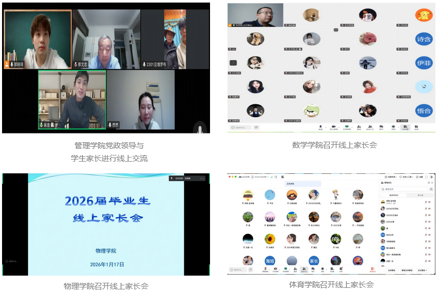 此外,各院系于同期相继组织线上家长会,搭建起“屏对屏”的暖心交流平台。院系党政负责人、班导师及辅导员围绕学生学业表现、假期安全防护、假期生活规划、成长关怀引导四大维度,与家长深入分享交流;针对考研备考、就业发展前景等家长普遍关切的热点问题,老师们逐一细致解答,凝聚家校协同共育的强大合力,为学生全面成长成才保驾护航。
