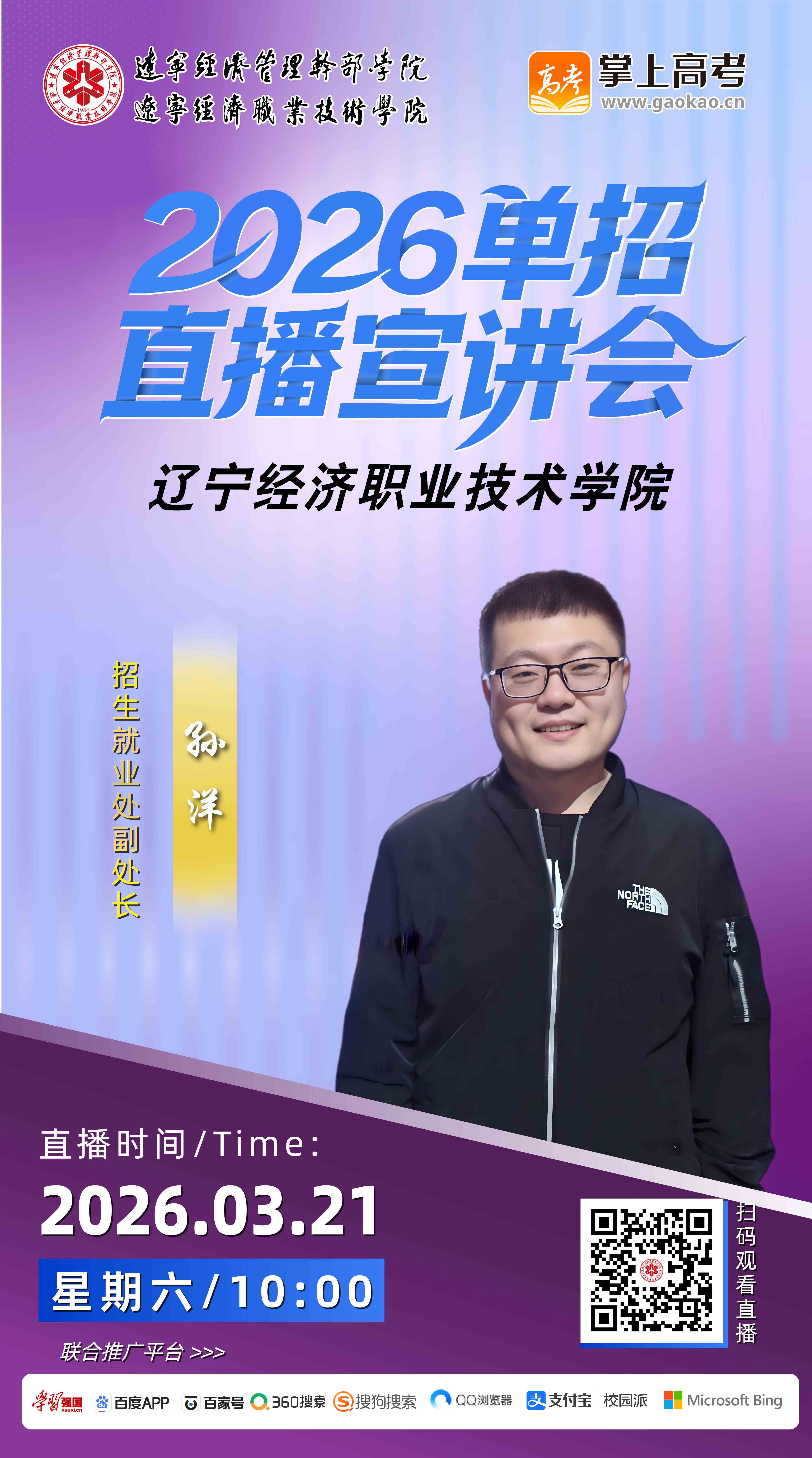 为更好地服务广大考生及家长,搭建高校与生源之间的沟通桥梁,辽宁经济职业技术学院定于3月21日举办“2026年高职单招直播宣讲会”。本次活动特邀学校招生就业处副处长孙洋担任主讲嘉宾,将通过线上直播形式,深度解读单招报考政策,权威解答考生及家长关心的热点难点问题。