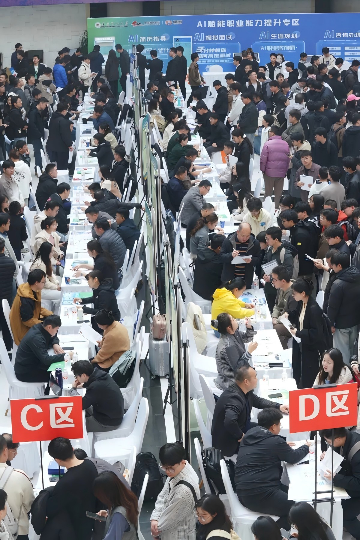 会场科学划分11大特色专区,包含国防科技行业专区、电子机械和器材制造业专区、汽车制造行业专区等,实现行业资源集中展示、岗位信息精准推送,进一步优化招聘体验,促进企业和学生高效对接、精准洽谈。在就业指导AI互动专区,工作人员依托数智化就业服务平台,为毕业生提供智能简历诊断、岗位精准匹配、就业政策解读、求职咨询辅导等全流程一站式服务,以科技赋能提升求职效率与应聘质量。此外,会场还设置了企业签到区与综合服务处,为校企生三方提供全方位服务和保障。