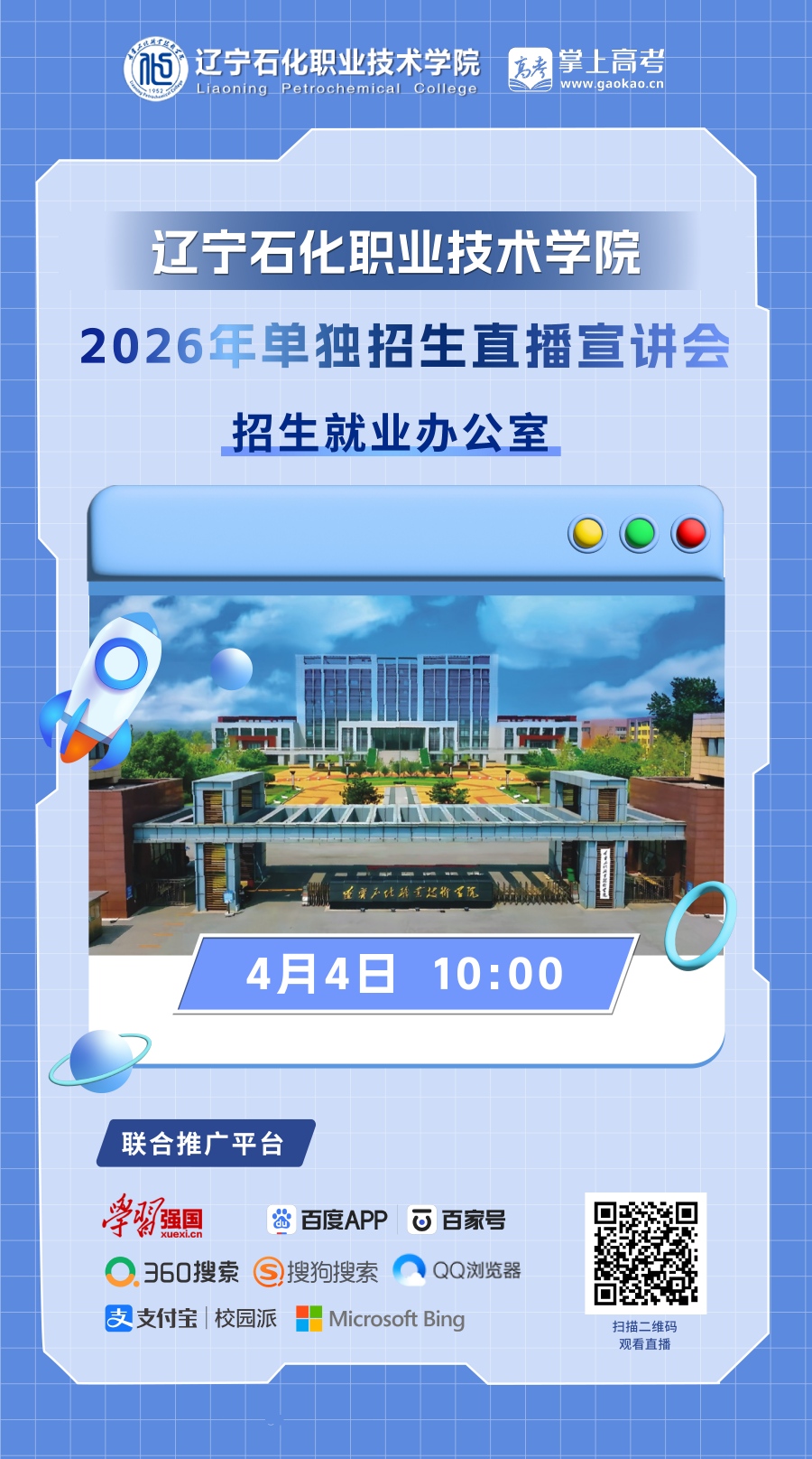 为更好地服务广大考生及家长,搭建高校与生源之间的沟通桥梁,辽宁石化职业技术学院定于4月4日举办“2026年单独招生直播宣讲会”。本次活动特邀学校招生就业办公室通过线上直播形式,深度解读单招报考政策,权威解答考生及家长关心的热点难点问题。