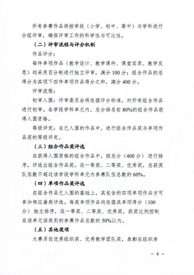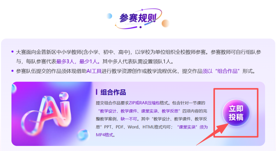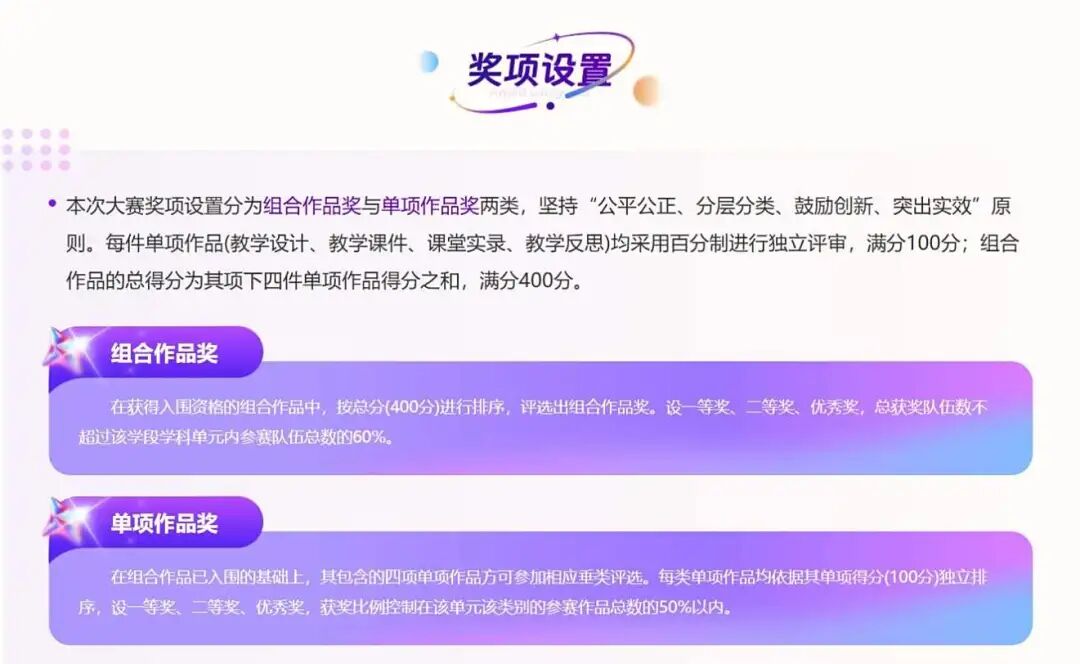 参赛作品须以“组合作品”形式提交,包含以下四项内容,缺一不可:针对一节课的“教学设计+教学课件+课堂实录+教学反思“。