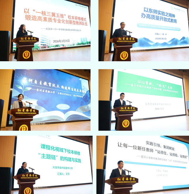 大连市一〇一中学教育集团构建了“一核三翼五维”校本研修模式,依托“八步备课流程”与三级监管,推动集团内资源共建共享。东北师范大学大连保税区实验学校以“少年党校+”大思政课程体系为引领,创新体制机制,强化立德树人。金州区实验小学推出“三格五训两自主”模式,内驱教师成长,外化学生素养。大连经济技术开发区新桥小学以“桥·见”文化为基,构建“四纵四横”校本研修体系,促进教师专业成长和学校内涵发展。金州区春华小学构建“主题链”体系,破解了校本研修碎片化难题,提升系统性与实效性。金普新区星河小学教育集团创新“334”三维协同成长模式,分层赋能新任教师成长路径。