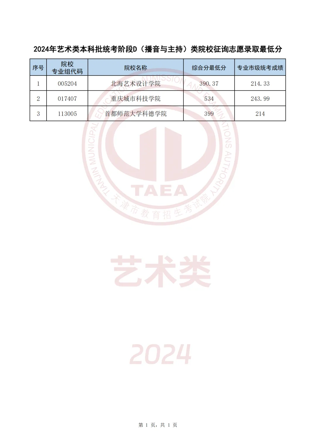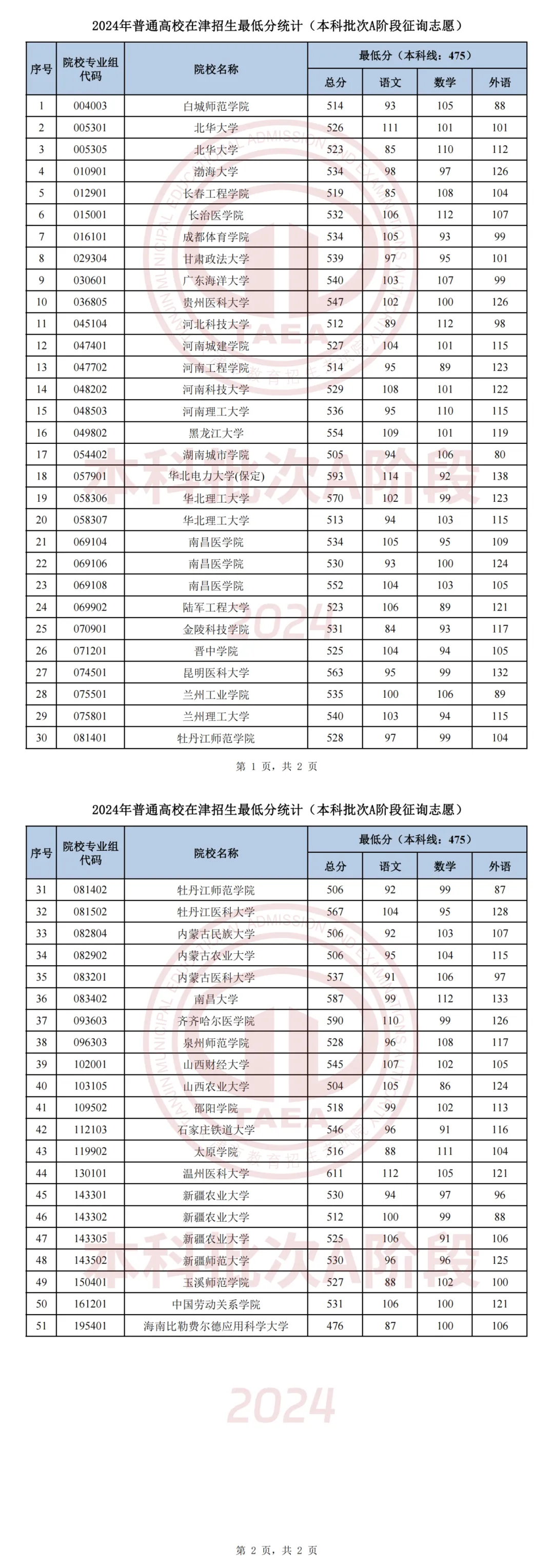 天津2024年普通高校招生本科批次A阶段征询志愿、艺术类本科批次征询志愿及体育类本科批次征询志愿录取工作已结束。7月25日9时起,考生可以通过登录招生院校网站、招考资讯网(www.zhaokao.net)、微信小程序“天津招考”、津心办APP、津云客户端等多种途径查询征询志愿的录取结果。现将征询志愿最低分统计公布如下: