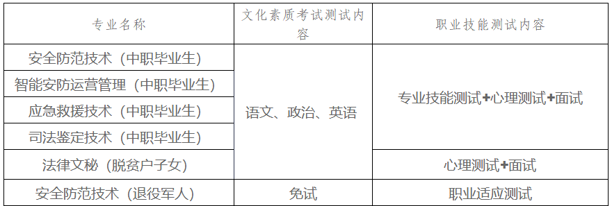 第十四条 此次高职单招招生考试采取“文化素质+职业技能测试”的模式,考试时间为4月6日(其中文化素质测试时间为9:00—11:30,职业技能测试时间为14:00)。各专业考试方式具体见下表。