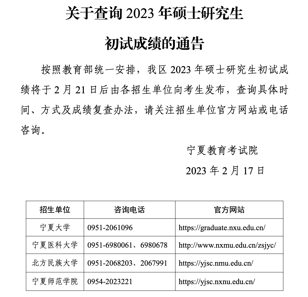宁夏2023年考研初试成绩2月21日公布