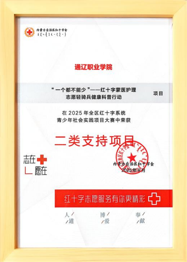 近期,由内蒙古自治区红十字会主办的2025年全区红十字会系统志愿服务和青少年社会实践项目大赛圆满落幕。此次大赛以“志在愿在・善言善行”为主题,经过多轮评审,共有10个青少年社会实践项目获得项目支持,由通辽职业学院团委和护理系推送的“一个都不能少——红十字蒙医护理志愿轻骑兵健康科普行动”项目,凭借鲜明的志愿服务特色、创新的服务模式与扎实的实践成效,成功获评二类支持项目,为学校红十字志愿服务工作再添亮眼成果。