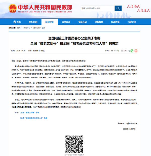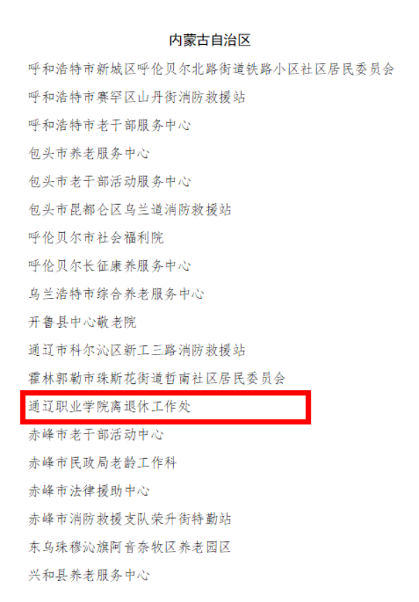 近日,全国老龄工作委员会办公室正式印发表彰决定,通辽职业学院离退休工作处凭借在为老服务领域的突出表现与卓越贡献,光荣荣获全国“敬老文明号”称号。这一国家级殊荣,是对学院老龄工作成效的最高肯定,更是全体离退休工作者践行初心、担当使命的生动见证。