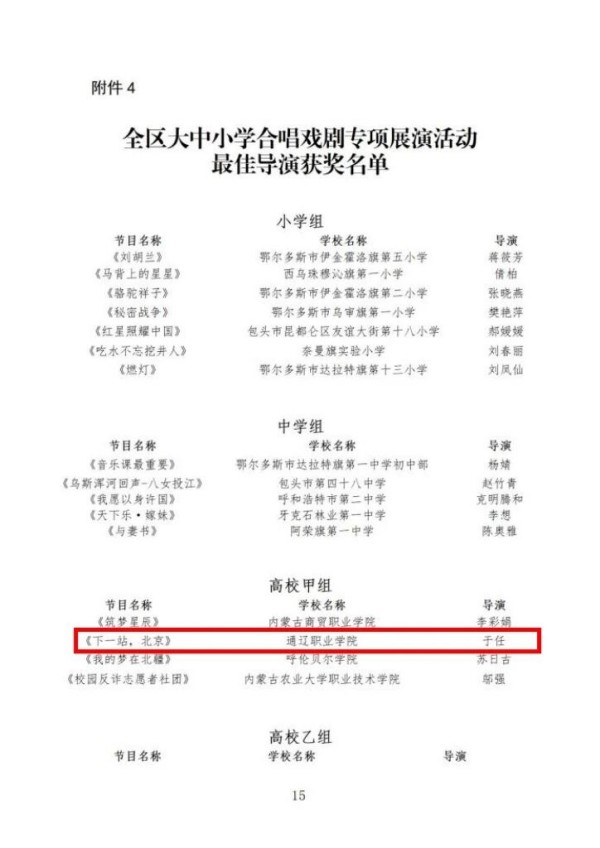 10月24日,在内蒙古自治区教育厅精心筹办的2025年全区大中小学合唱、戏剧专项艺术展演盛会中,通辽职业学院自编自导的舞台剧《下一站,北京》以卓越的舞台表现力和深邃的思想内容独占鳌头,荣膺戏剧专项高校甲组(非专业组)一等奖。于任获评最佳导演奖,于丽娜、潘阳、吴宏伟荣获优秀指导教师奖。舞台剧演员由机电工程系和师范教育系的学生共同组成。这一成就充分展示了学院在美育领域的坚实基础和卓越的教育质量。