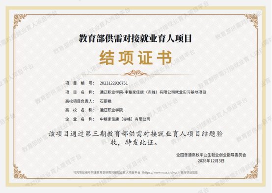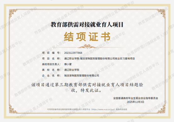 12月4日,通辽职业学院农牧系申报的《通辽职业学院-中粮家佳康(赤峰)有限公司就业实习基地项目》与《通辽职业学院-瑞派宠物医院管理股份有限公司就业实习基地项目》,顺利通过第三期教育部供需对接就业育人项目结题验收,并获得全国普通高校毕业生就业创业指导委员会颁发的结项证书。