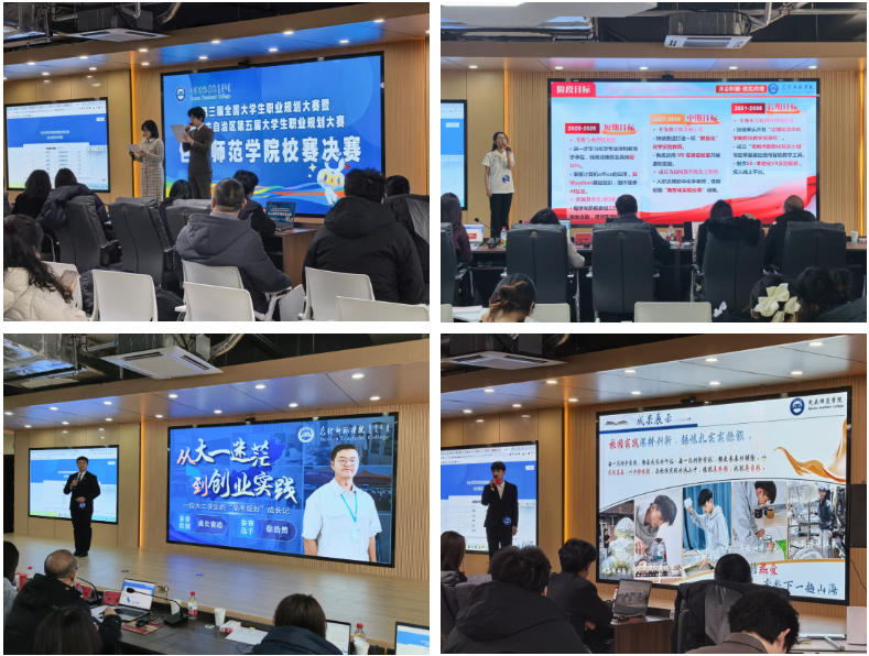 本次大赛紧扣“以赛促学、以赛促教、以赛促就”目标,严格遵循全国大学生职业规划大赛的赛道设置与评审标准。成长赛道面向中低年级学生,重点考察职业目标设定的科学性、成长路径的可行性及综合素质提升成效,25名选手通过7分钟主题陈述与5分钟评委问答,系统阐述了个人职业理想、能力现状分析及阶段性行动规划。从教育行业深耕到文创领域创新,从公益服务践行到技术岗位攻坚,选手们的规划方案既立足专业所长,又贴合社会需求,展现了新时代青年积极向上的择业观。