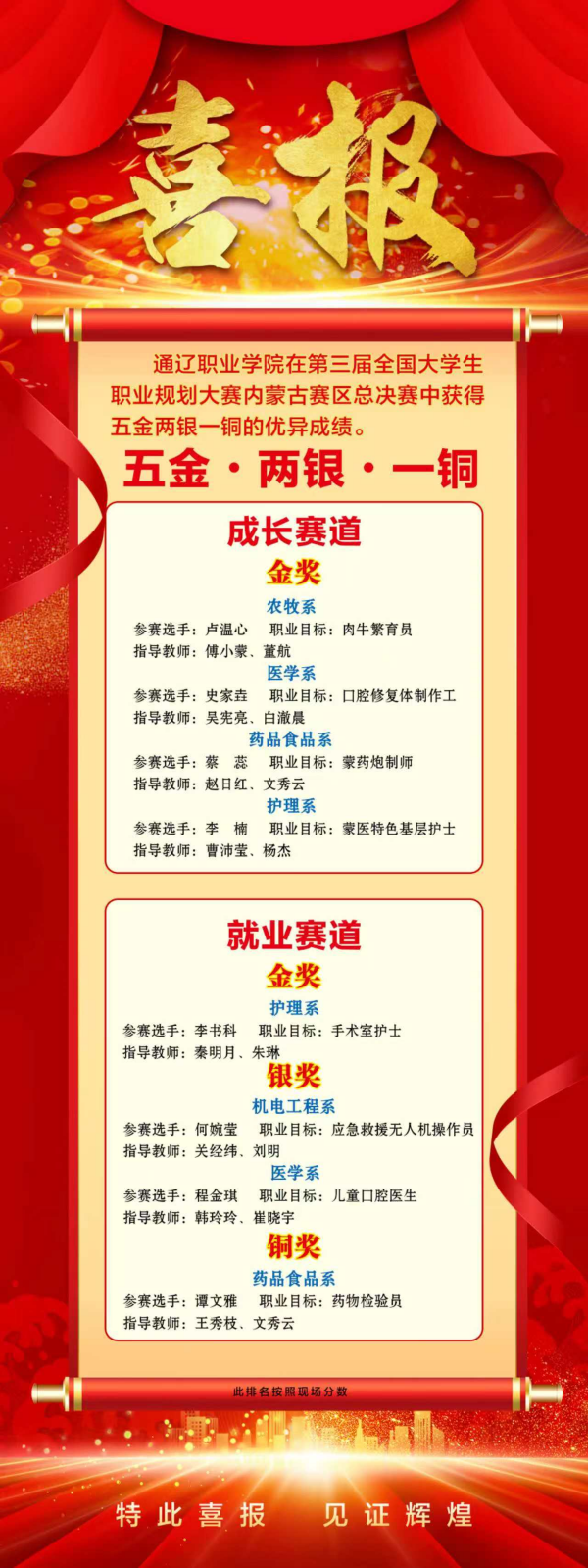 日前,第三届全国大学生职业规划大赛内蒙古赛区总决赛在内蒙古工业大学圆满落幕。通辽职业学院9名参赛学子凭借扎实的专业功底和出色的现场表现,最终斩获金奖5项、银奖2项、铜奖1项及赛事优秀组织奖。就业赛道李书科以总成绩第一、成长赛道卢温心以总成绩第二的绝对优势入围国赛。在全国大学生职业规划大赛举办三载之际,再度刷新赛场佳绩,以硬核实力彰显学院在职业规划教育领域的深厚底蕴与育人实力。