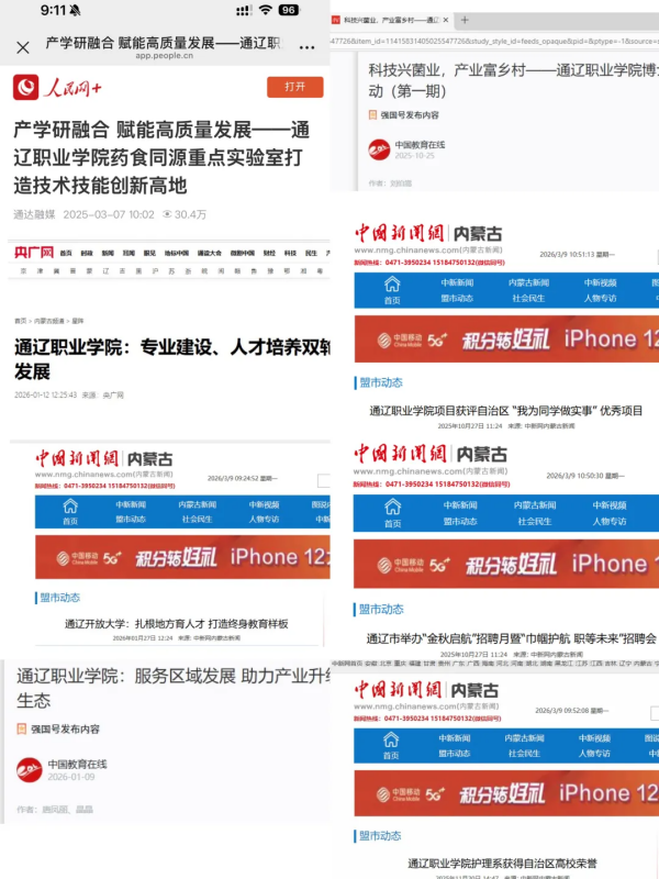 宣传阵地实现跨越式升级。成立融媒体中心,构建校园融媒体矩阵,建立以官方平台、系部平台和学生社团为核心的三级宣传阵地,形成官网、微信、视频号、抖音号协同联动的传播体系。第二次党代会至今,年均发布短视频近200条、新闻1000则。学院构建起覆盖传统媒体与新兴媒体、官方平台与行业媒体的全方位外宣宣传格局,市级以上媒体发稿1200余篇,其中人民网、央广网、中国新闻网、学习强国等央媒发稿180余条。通辽日报刊发《通辽职业学院办学70周年系列报道》《通辽职业学院:以“三个通辽”办学理念 赋能助力通辽高质量发展》等专版,全方位报道办学经验,学院知名度与社会影响力持续扩大。拍摄制作学院宣传片、专题片及《江山》《没有共产党就没有新中国》等MV,其中《江山》被自治区推荐至中宣部参评。